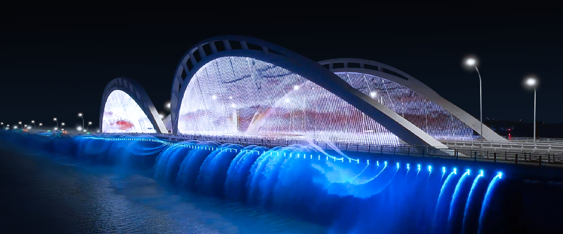 杭州亞運(yùn)會(huì)重點(diǎn)照明工程,聲、光、電協(xié)同嚴(yán)總橋梁水幕燈光秀,營(yíng)造沉浸式夢(mèng)幻夜景。 迎八方來(lái)客,為亞運(yùn)造勢(shì)。